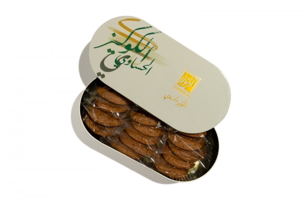 علبة بيضاوية تنك غذائية بعدد 15 قطعة كوكيز حساوي مزيج بين التمر الفاخر وجوز البيكان .