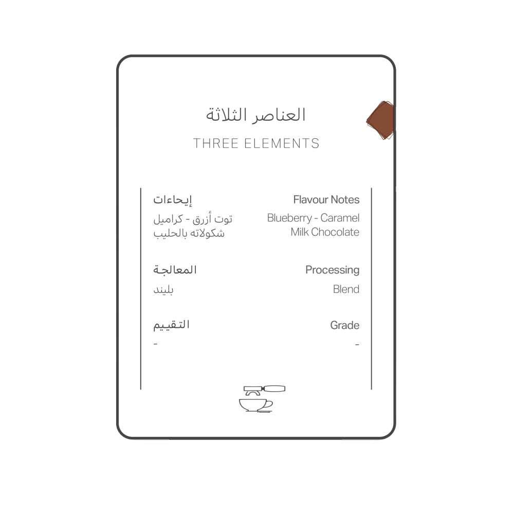 يتم تصنيع مزيج "العناصر الثلاثة" لتقديم تجربة إسبرسو فريدة مع تعقيد لذيذ. يتميز بنغمات نابضة بالحياة من التوت الأزرق والكراميل، متوازنة بنعومة كريمية من الشوكولاتة بالحليب، هذا المزيج مصمم لأولئك الذين يبحثون عن شيء خاص في فنجانهم. قد تختلف أصول وأصناف المزيج، لكن تركيزه الدائم هو على تقديم تجربة طعم استثنائية. مثالي للتحضير المنزلي أو للاستخدام في المقاهي، يضمن هذا المزيج تجربة غنية ومرضية سواء كإسبريسو أو قهوة اليوم.